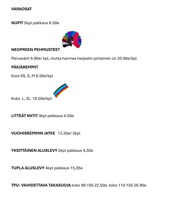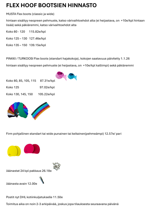 Hinnat: Vuolusta veloitan 30 -60e riippuen työn määrästä sovituksen yhteydessä, pelkkä sovitus 30e ja matkakuluja 10-50e, riippuen matkasta ja kuinka monta sovitusta on samalla seudulla. Alta löytyy flex hoof bootsien erillinen hinnasto